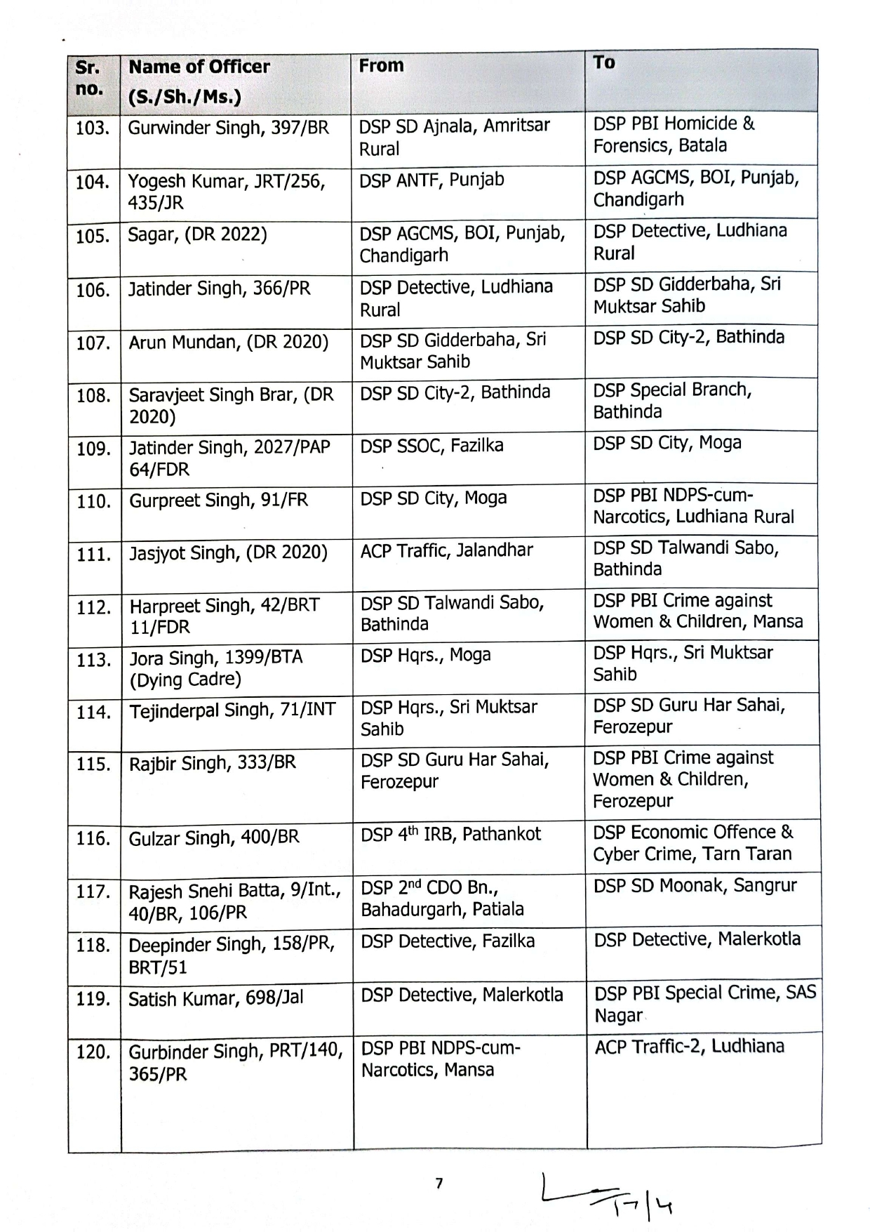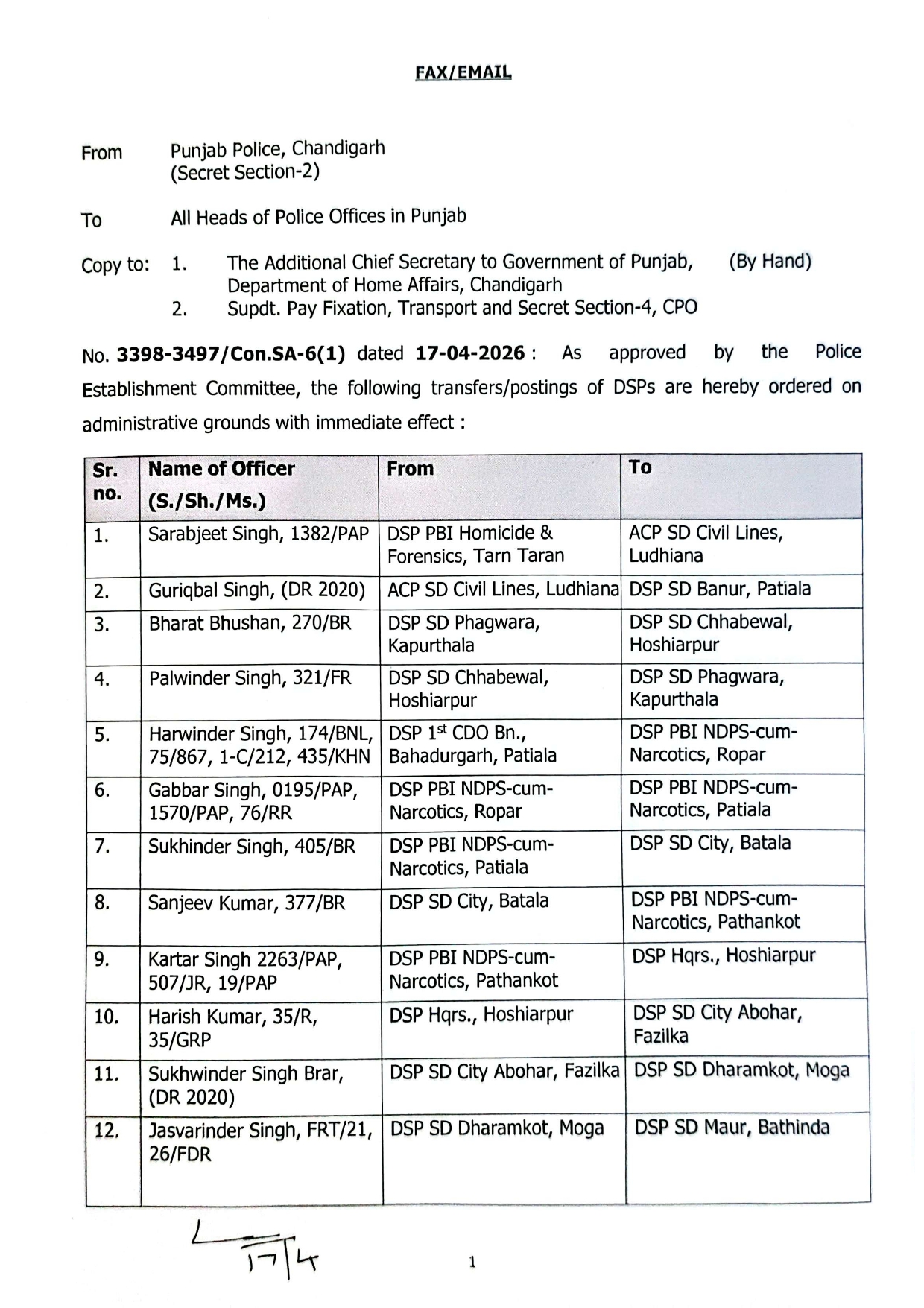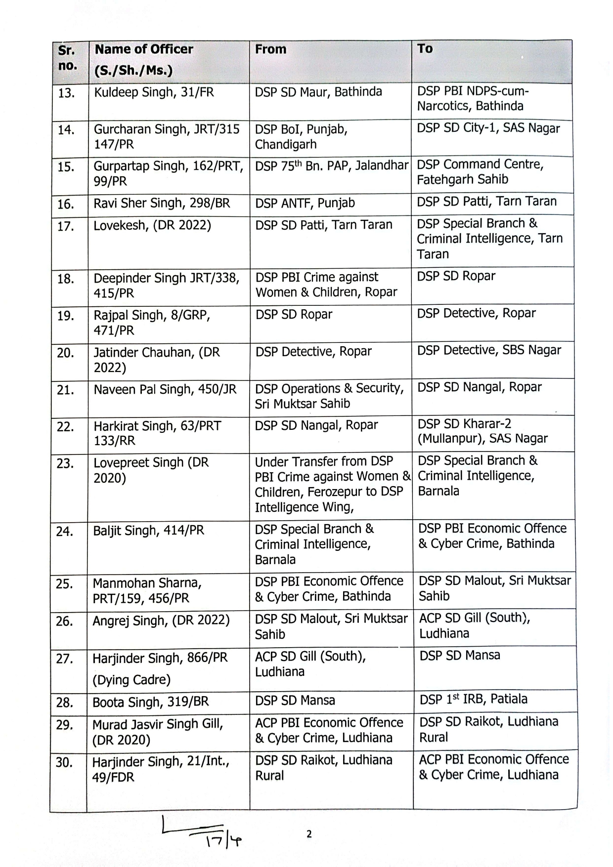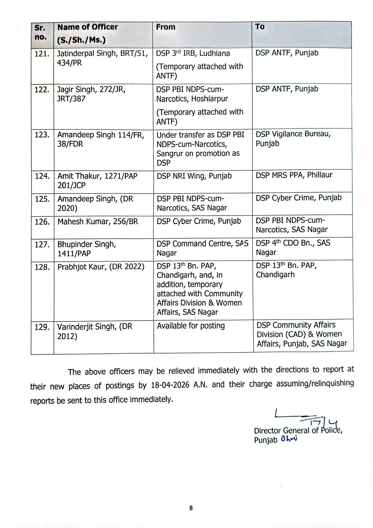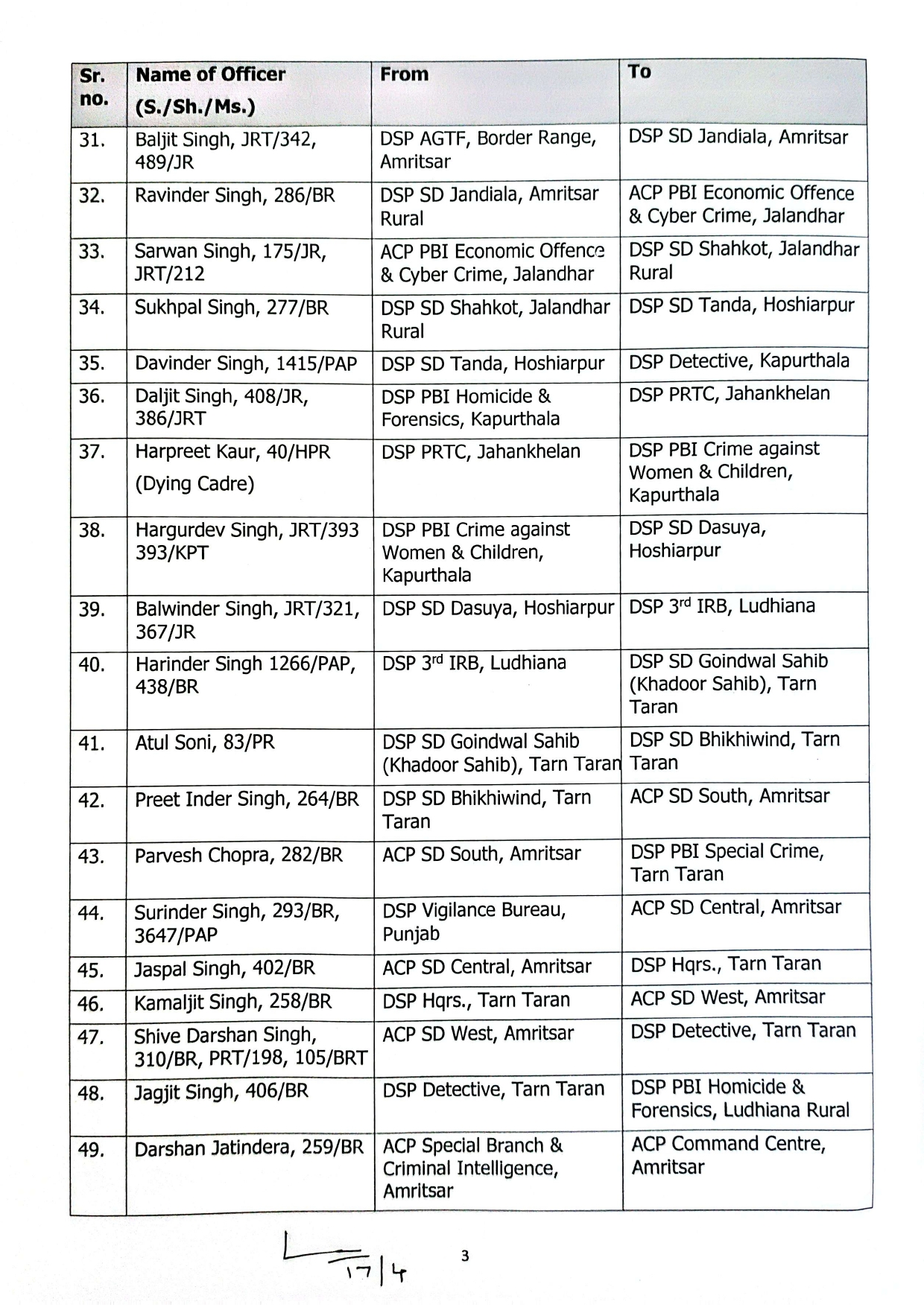 जालंधर। पंजाब पुलिस विभाग में बड़ा फेरबदल हुआ है। राज्य में नगर निगम चुनाव की घोषणा से पहले सरकार ने 129 डीएसपी/एसीपी रैंक के अधिकारियों का तबादला कर दिया है।