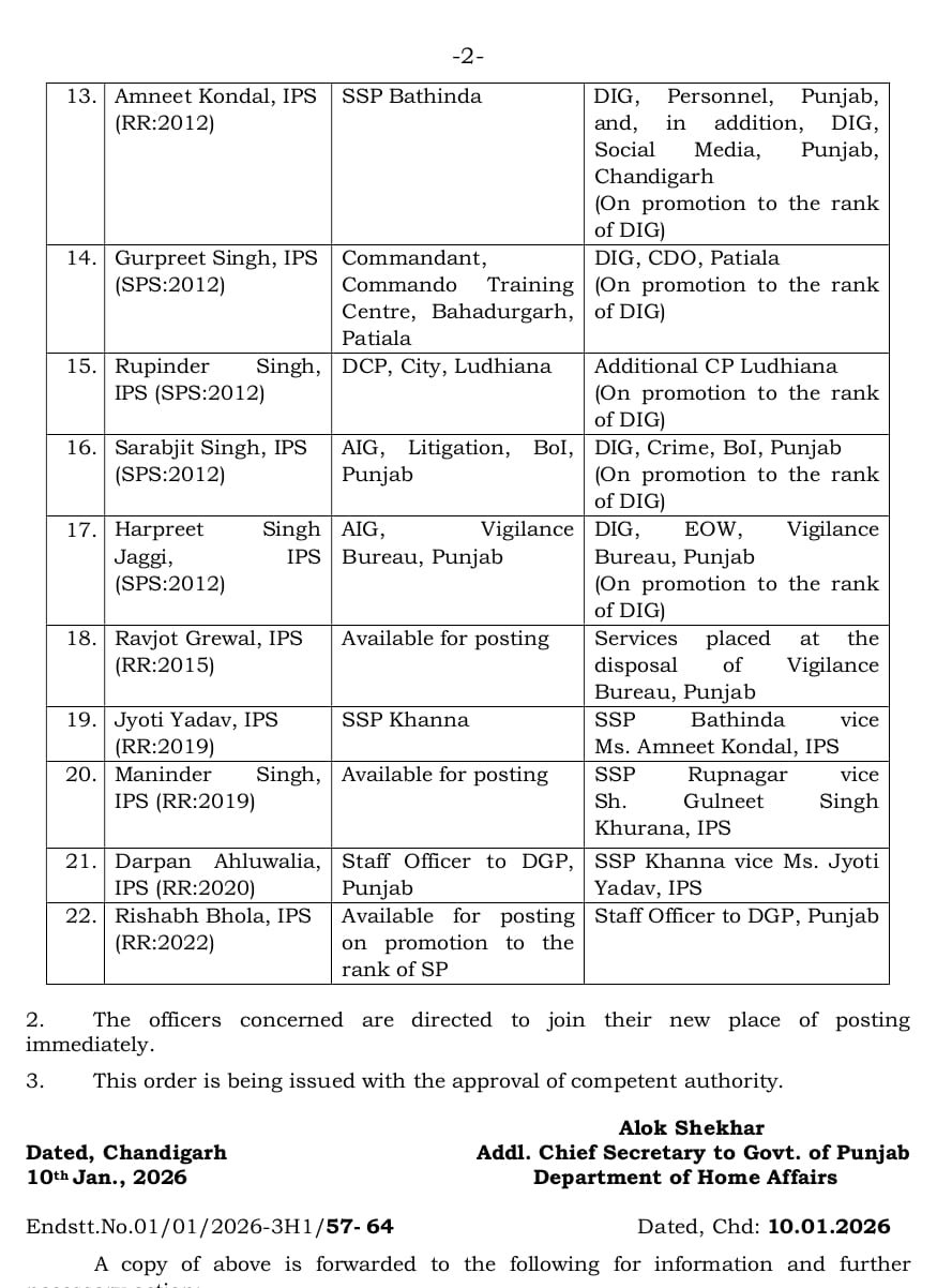 Chandigarh चंडीगढ़। पंजाब पुलिस में आईपीएस अधिकारियों की ट्रांसफर हुई हैं।