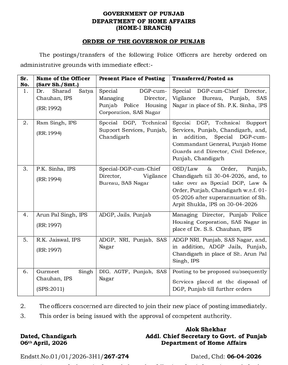 चंडीगढ़। पंजाब के 6 वरिष्ठ आईपीएस अधिकारीयों का तबादला किया गया है। वरिष्ठ आईपीएस शरद सत्य चौहान को विजिलेंस ब्यूरो का चीफ डायरेक्टर तैनात किया गया है