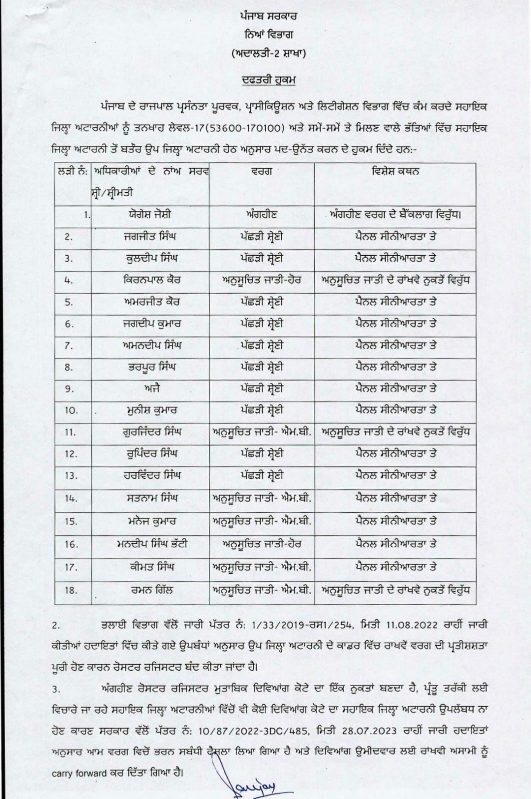 चंडीगढ़। पंजाब के प्रोसिक्यूशन एवं लिटीगेशन विभाग में पदौन्नतियां दी गई है। राज्यपाल द्वारा राज्य के 18 एडीए को पदौन्नत कर डिप्टी डीए बनाया गया है।