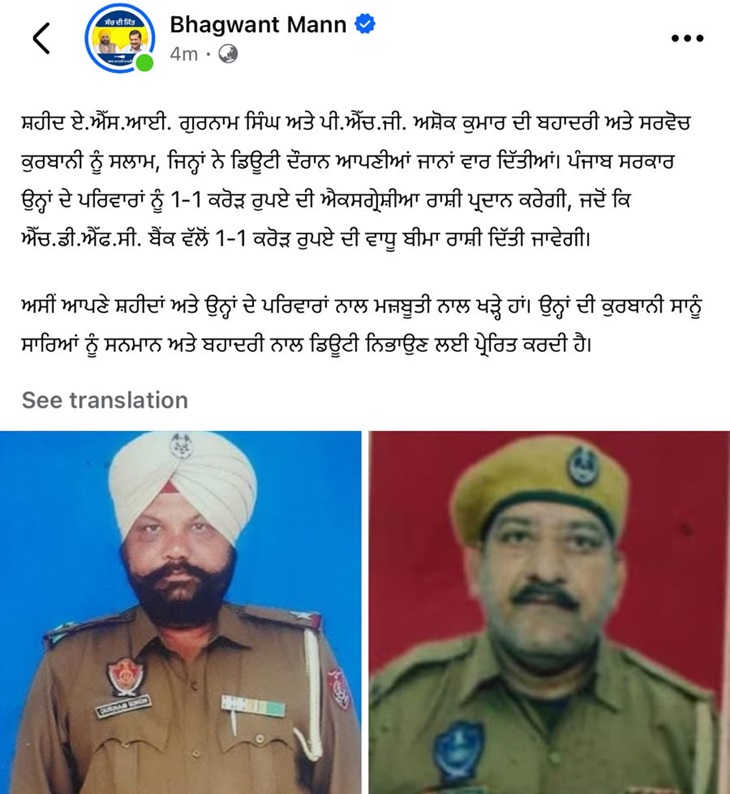 CM भगवंत मान ने दोनों के परिवार के लिए 2-2 करोड़ रुपए का ऐलान किया है। मान ने कहा कि सरकार उनकी कुर्बानी को सलाम करती है।