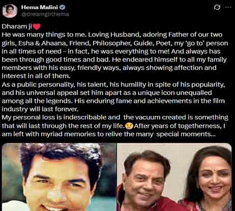 ये पोस्ट बयां करता है कि हेमा मालिनी और धर्मेंद्र का रिश्ता कितना गहरा था. दोनों बेशक अपने अपने कामकाज में बिजी रहे हो लेकिन हमेशा एक दूसरे की ढाल बनकर खड़े रहे हैं.