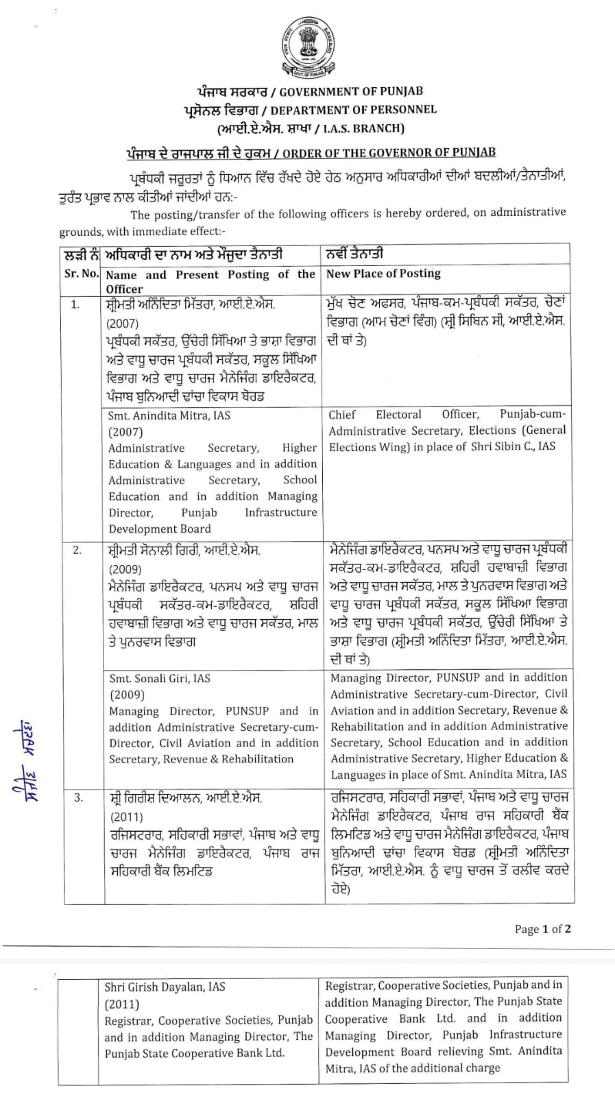 Chandigarh चंडीगढ़। पंजाब सरकार द्वारा आईएएस अधिकारियों की ट्रांसफर की गई है।