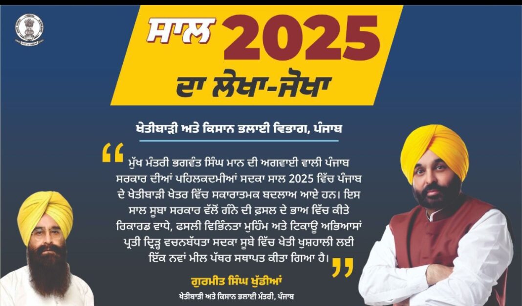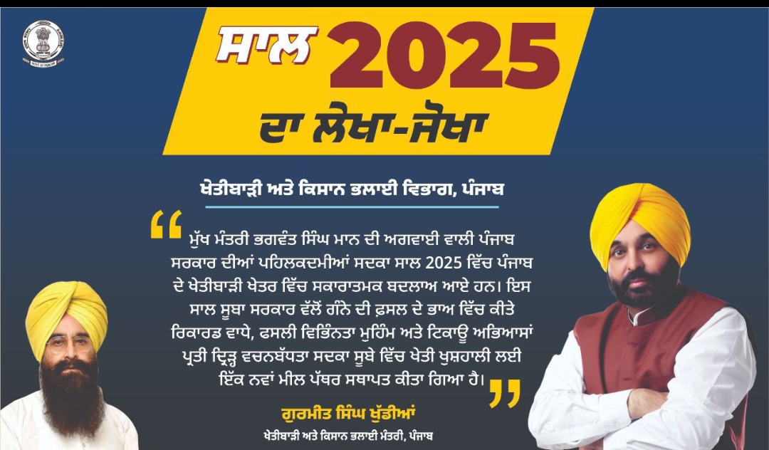 Chandigarh चंडीगढ। मुख्यमंत्री श्री भगवंत सिंह मान के नेतृत्व वाली पंजाब सरकार की पहलकदमों के कारण वर्ष 2025 में पंजाब के कृषि क्षेत्र में सकारात्मक बदलाव आए हैं। इस वर्ष प्रदेश सरकार द्वारा गन्ने की फसल के भाव में की रिकॉर्ड वृद्धि, फसली विविधता अभियान तथा टिकाऊ प्रथाओं के प्रति दृढ़ प्रतिबद्धता के कारण प्रदेश में कृषि खुशहाली के लिए एक नया मील का पत्थर स्थापित किया गया है।