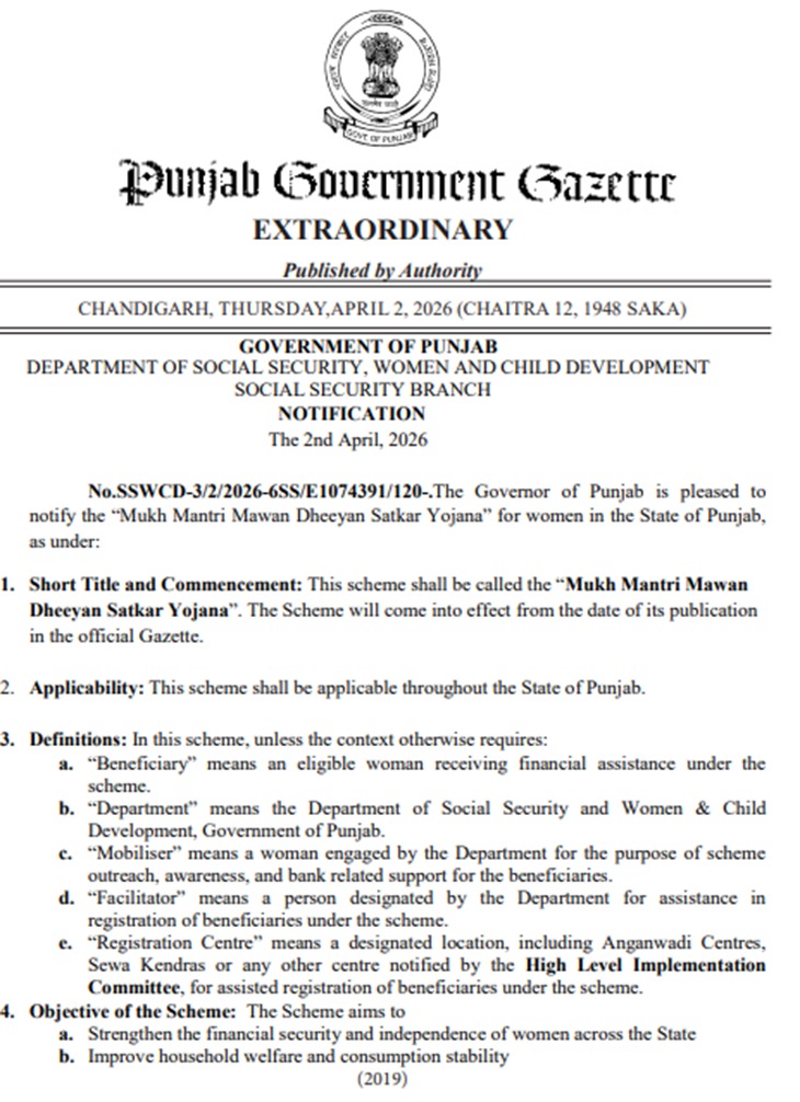 जालंधर। पंजाब में मुख्यमंत्री मावां-धीयां सत्कार योजना का नोटिफिकेशन सरकार ने जारी कर दिया है।