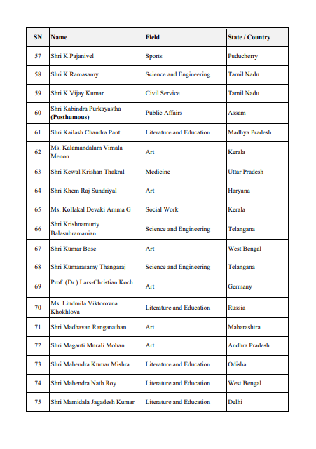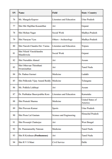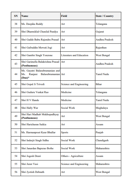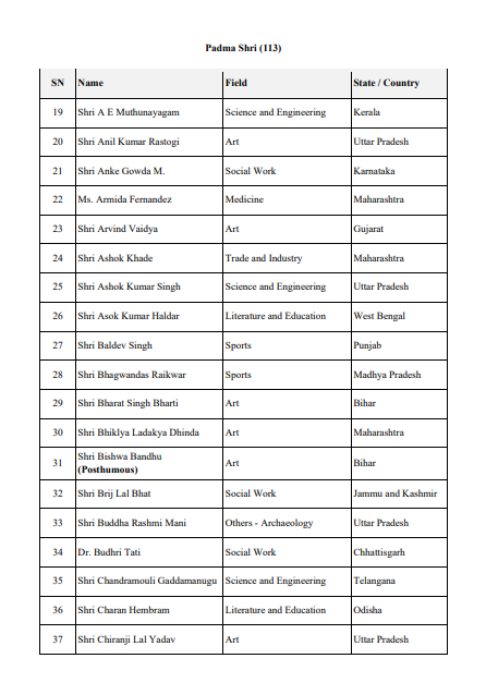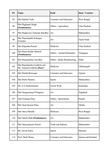 क्रिकेटर रोहित शर्मा, पैरा एथलीट प्रवीण कुमार, महिला क्रिकेट टीम की कप्तान हरमनप्रीत कौर, हॉकी प्लेयर सविता पूनिया समेत 113 हस्तियों को पद्मश्री के लिए चुना गया है।