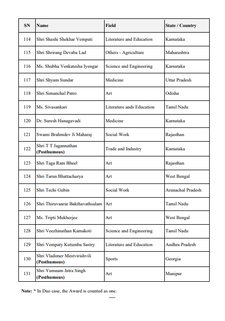 गृह मंत्रालय द्वारा जारी विज्ञप्ति अनुसार इस वर्ष कुल 131 पद्म पुरस्कार प्रदान किए जाएंगे। इनमें 5 पद्म विभूषण, 13 पद्म भूषण और 113 पद्म श्री शामिल हैं।