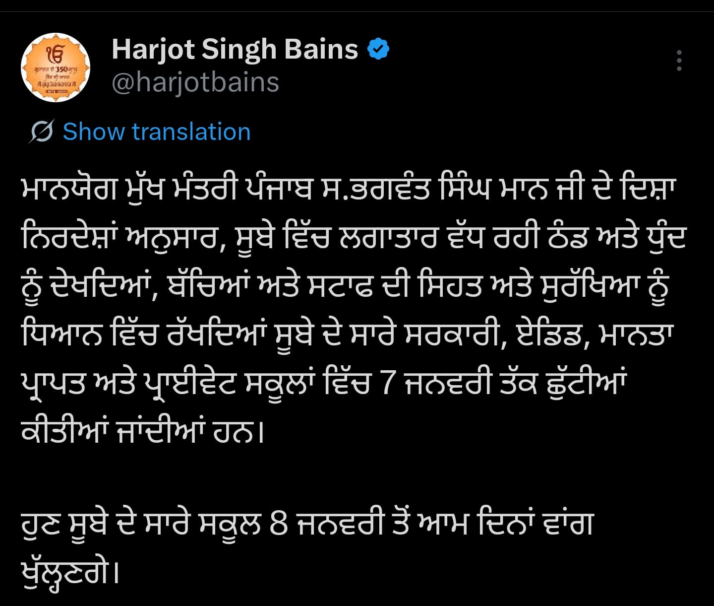 एक्स पर दी जानकारी के मुताबिक पंजाब में अब स्कूल 7 जनवरी तक बंद रहेंगे। हरजोत बैंस ने एक्स पर जानकारी दी है कि सीएम भगवंत मान के निर्देशानुसार राज्य में बढ़ रही सर्दी और धुंध को देखते हुए तथा बच्चों और स्टाफ की सेहत और सुरक्षा को ध्यान में रखते हुए राज्य के सभी सरकारी, एडिड, मान्यता प्राप्त और प्राईवेट स्कूल 7 जनवरी तक बंद रहेंगे। 8 जनवरी को स्कूल रूटीन टाइमिंग पर खुलेंगे।