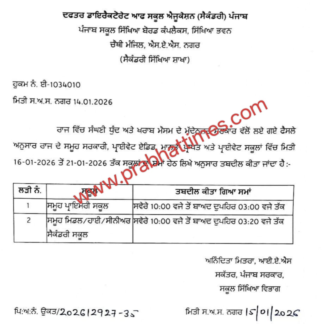 पंजाब के स्कूल शिक्षा विभाग के सचिव द्वारा जारी आदेश के मुताबिक राज्य में धुंध और खराब मौसम के मद्देनज़र सरकार द्वारा लिए गए फैसले के मुताबिक सभी सरकारी, प्राईवेट एडिड, मान्यता प्राप्त तथा प्राईवेट स्कूल के समय में बदलाव किया गया है।
