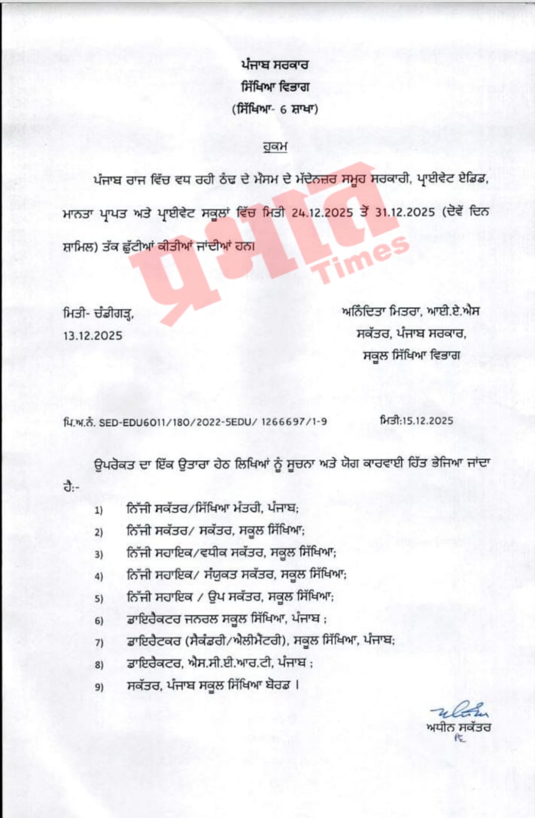 पंजाब सरकार के शिक्षा विभाग के सचिव द्वारा जारी आदेश के मुताबिक राज्य में 24 दिसंबर से लेकर 31 दिसंबर तक सर्दियों की छुट्टियां रहेंगी।