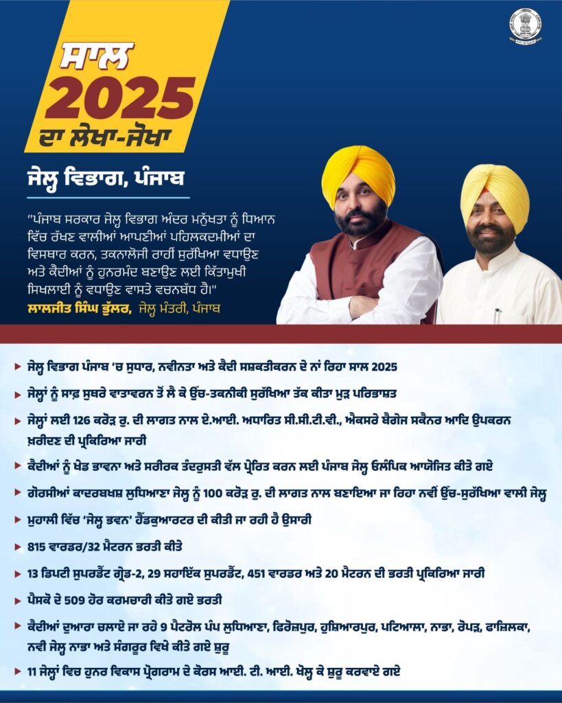 कैबिनेट मंत्री ने वर्ष 2025 की पहलों का विस्तार से उल्लेख करते हुए कहा कि मुख्यमंत्री भगवंत सिंह मान के नेतृत्व में 815 वार्डर और 32 मैट्रन की भर्ती की जा चुकी है।